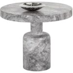A clasically chic end table with an elegant design. Featured a round table top with a curved tabletop base in matching grey faux marble finished concrete.