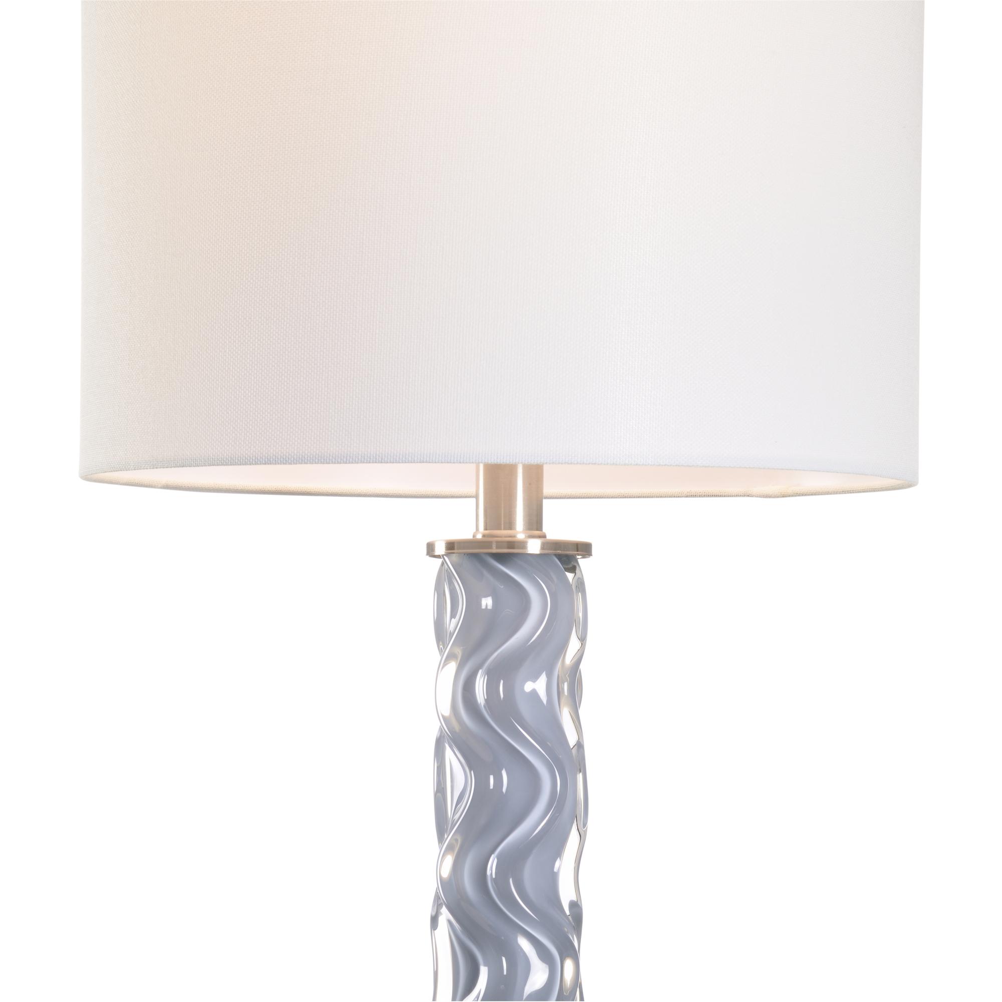 Playful and minimalist, the Emily Table Lamp has a gray and glass wavy three-dimensional pattern on its thin flute body and a white marble base, finished with a white shade.