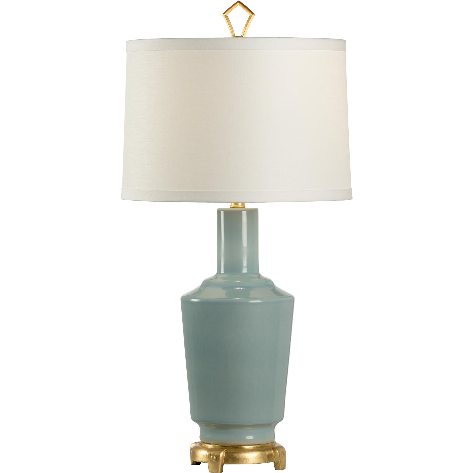 The Emma Lamp exudes timeless elegance with a refined silhouette and subtle vintage charm. A warm antique gold leaf base supports a blue glazed vintage-inspired ceramic vase, creating a sophisticated foundation for the classic drum shade. Topped with a geometric gold finial, this lamp brings graceful style and soft ambient light to any interior setting.