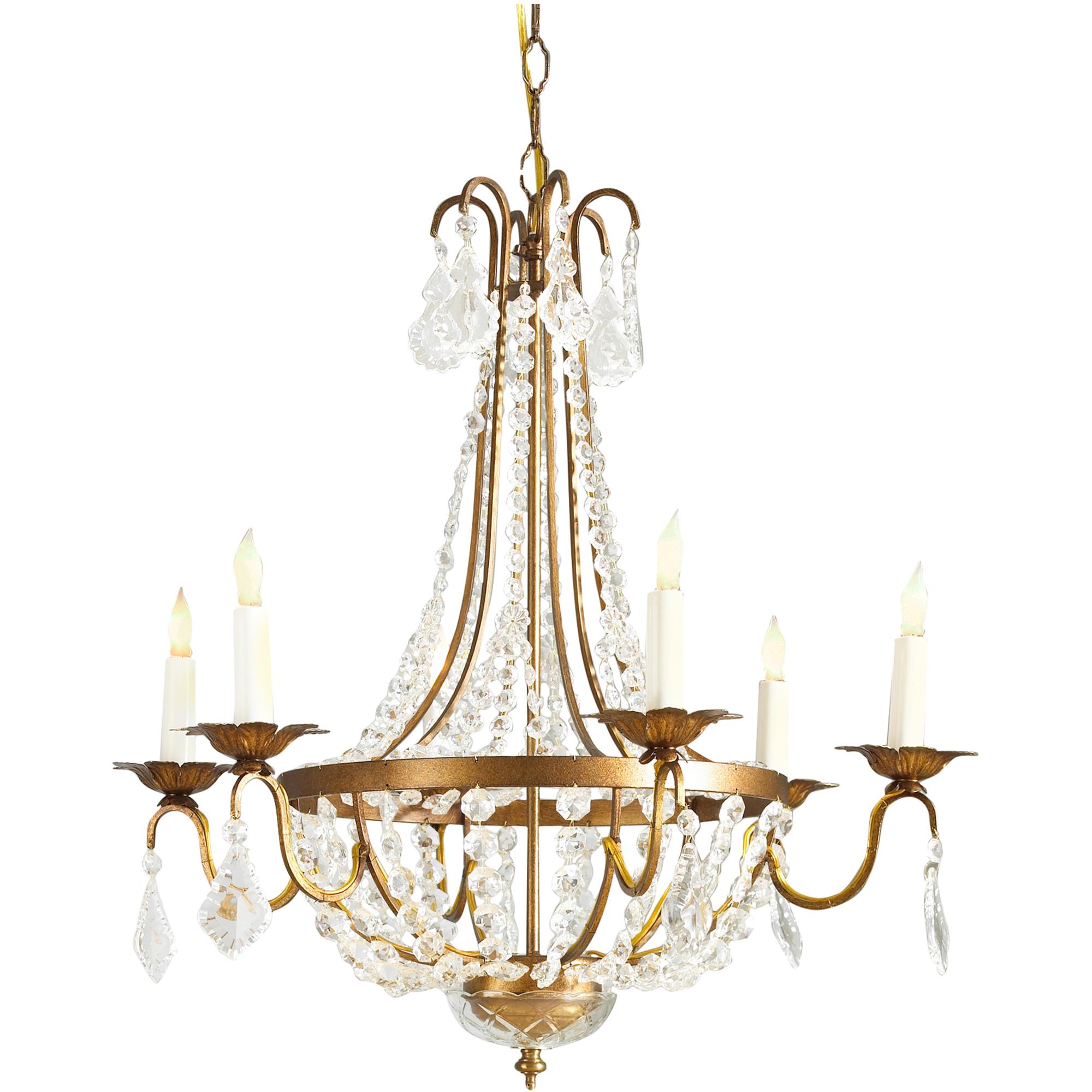 Italian gilt metal frame crystal drops and chains. Comes with 4′ of chain and a 5″ canopy.