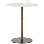 An Art Deco inspired round bar table, featuring a solid carrara marble top with an antique gold steel base. Perfect for bars, lounges and restaurants. As marble is a natural material, unique veining, pitting, fissures, micro-cracks and colour variations are all characteristics that add to the uniqueness and beauty of each piece.