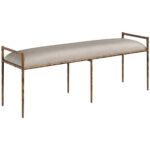 Rich with texture, this impressive bench is infused with an exotic touch. Stocked in zenith alabaster performance fabric, and completed with a hammered antique brass steel frame. Performance fabric is moisture repellent, durable and easy to clean. Made in India. With refined craftsmanship, this design was brought to life by skilled local artisans. By nature, these materials develop unique imperfections such as fissures, markings and colour variations for a truly one-of-a-kind piece.