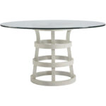 The Escape Dining Table creates a joyfully light focal point in spaces with a circular glass top supported by a unique, open-air base design in a smooth Sandbar finish. Glass top available in either 44” or 54”.