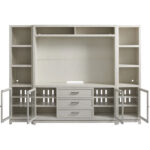 The ultimate entertainment furnishing, the Escape Complete Wall System features a series of shelves and drawers built within a left and right pier cabinet, a center hutch and a back panel, all finished in a Sandbar hue.