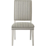 The Hamptons Dining Chair features a tall, slender silhouette upholstered in a finely striped fabric, strong tapered legs and a delicate nail head trim.