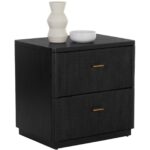The Etienne Nightstand boasts a linear profile with a warm design. Constructed from a rustic oak veneer with solid oak wood legs and a matching rope covering on the doors. Antique brass handles complement the piece. As wood is an organic, porous material, these pieces will contain natural variation of texture and may also exhibit fine indentations and cracks. Wood pieces will also display a disparity of colour and grain, and visible knots and burls that add to the character of each piece.