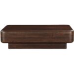 The Eton coffee table is a study in contrasts, marrying bold geometry with gentle curves. Crafted from rich Acacia wood, the substantial top appears to float above a recessed base, creating visual intrigue. Each piece showcases unique grain patterns through its thoughtful design and natural beauty as its dark brown finish matures the overall look.
