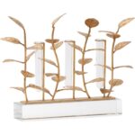 The Eucalyptus Gold Leaf Vase features three vases nestled a top of a bed of shimmering crystal, adorned with meticulously crafted gold leaf leaves that playfully conceal the vase, adding a touch of whimsical charm to any setting. Showcasing refined simplicity, offering a slender silhouette that gracefully displays your favorite blooms. Its transparent crystal base provides a stunning foundation, allowing light to dance and refract, enhancing the beauty of both the