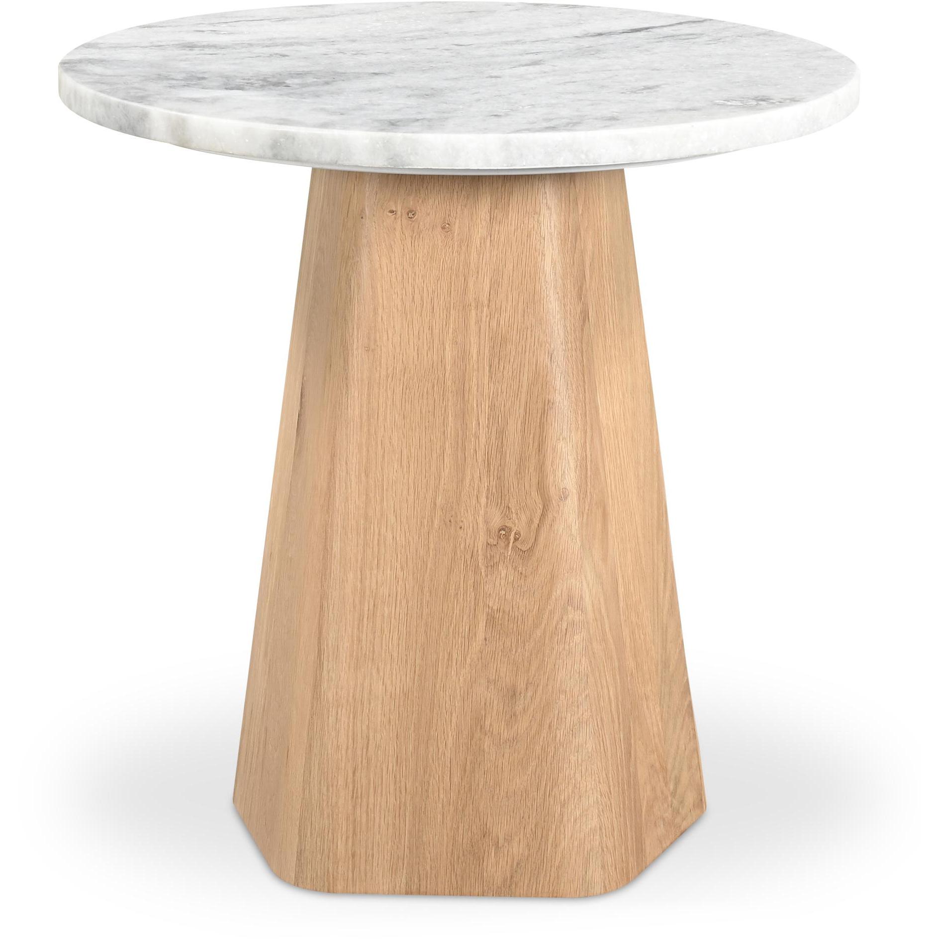 The Evelyn accent table is a harmonious contrast of materiality and tactility, where a weighty base meets a visually light marble top. With five connected sides equipped with softened, rounded edges, the base assumes an organic appearance, its natural color subtly softening the marble top for enduring visual appeal.