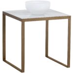 A beautiful modern marble end table. Tabletop features a 1″ layer of white Italian marble supported by an antique brass iron frame. As marble is a natural material, unique veining, pitting, fissures, micro-cracks and colour variations are all characteristics that add to the uniqueness and beauty of each piece.