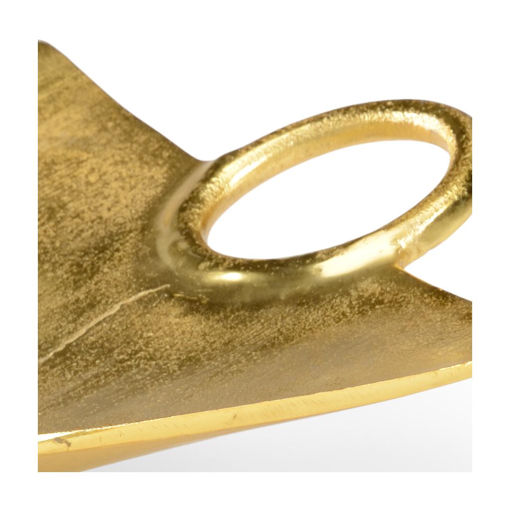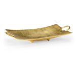 Enhance your home or office decor with this captivating handled dish. Crafted in cast aluminum with a lustrous bright gold finish, this contemporary style tray features ring handles and a subtle curved design. Use as a stand alone, or add a dried floral arrangement or your favorite decorative orbs to create a stunning accent for a credenza or bookcase in your home office, dining room or living area.