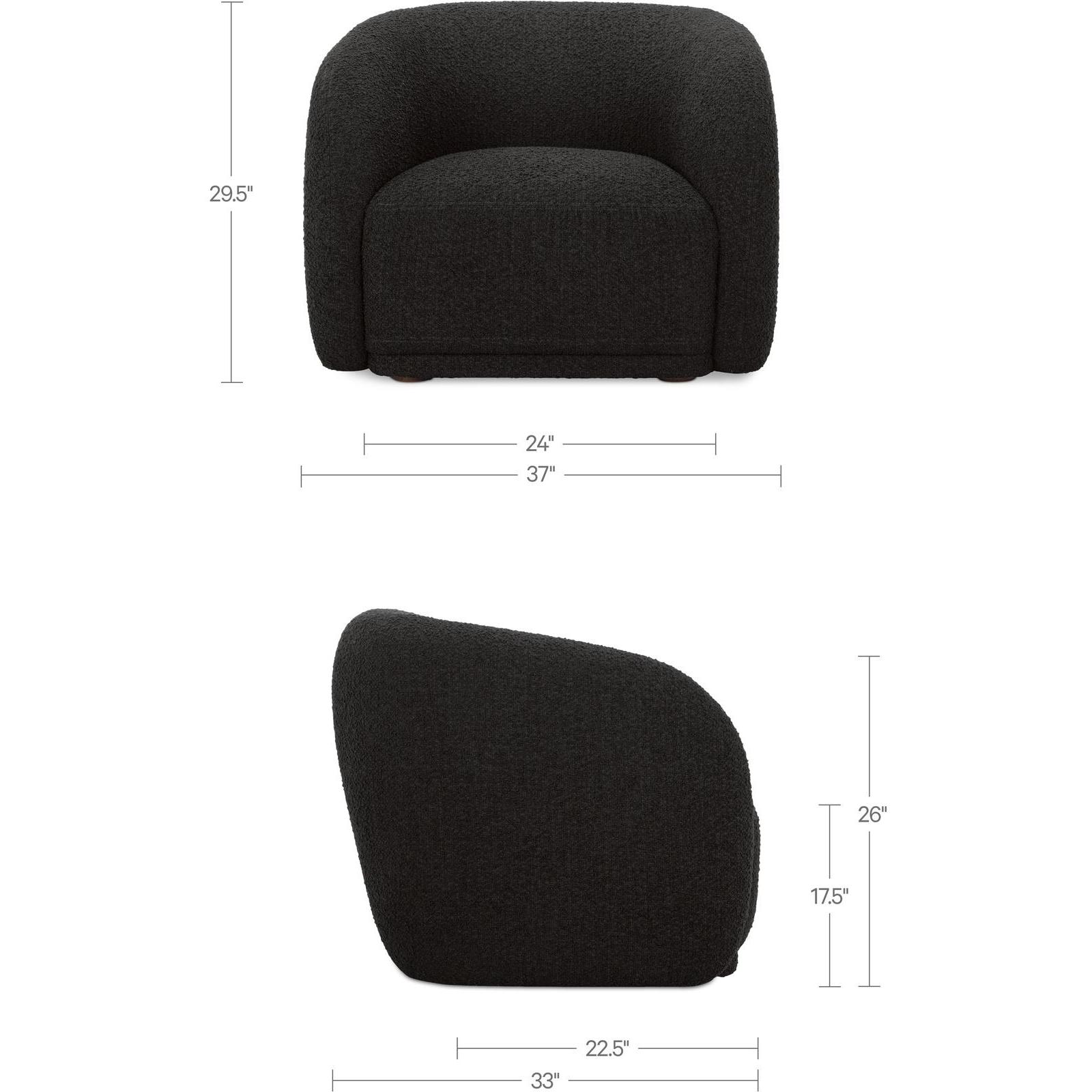 Constructed from solid beech and plywood, the Faye accent chair’s unique curved back and firm, fixed bench seat rest on petite, rounded rubberwood legs. The exaggerated boucle fabric has a robust 100,000 rub count bringing depth and an art deco feel to its contemporary form–a touch of elegance to expansive living.