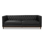 The Fielder sofa combines traditional elegance with contemporary resilience, featuring a soft textured fabric upholstery. The classic form includes tufted details, providing a nod to traditional aesthetics, while the clean lines and warm walnut finish on the wooden base inject a modern touch.