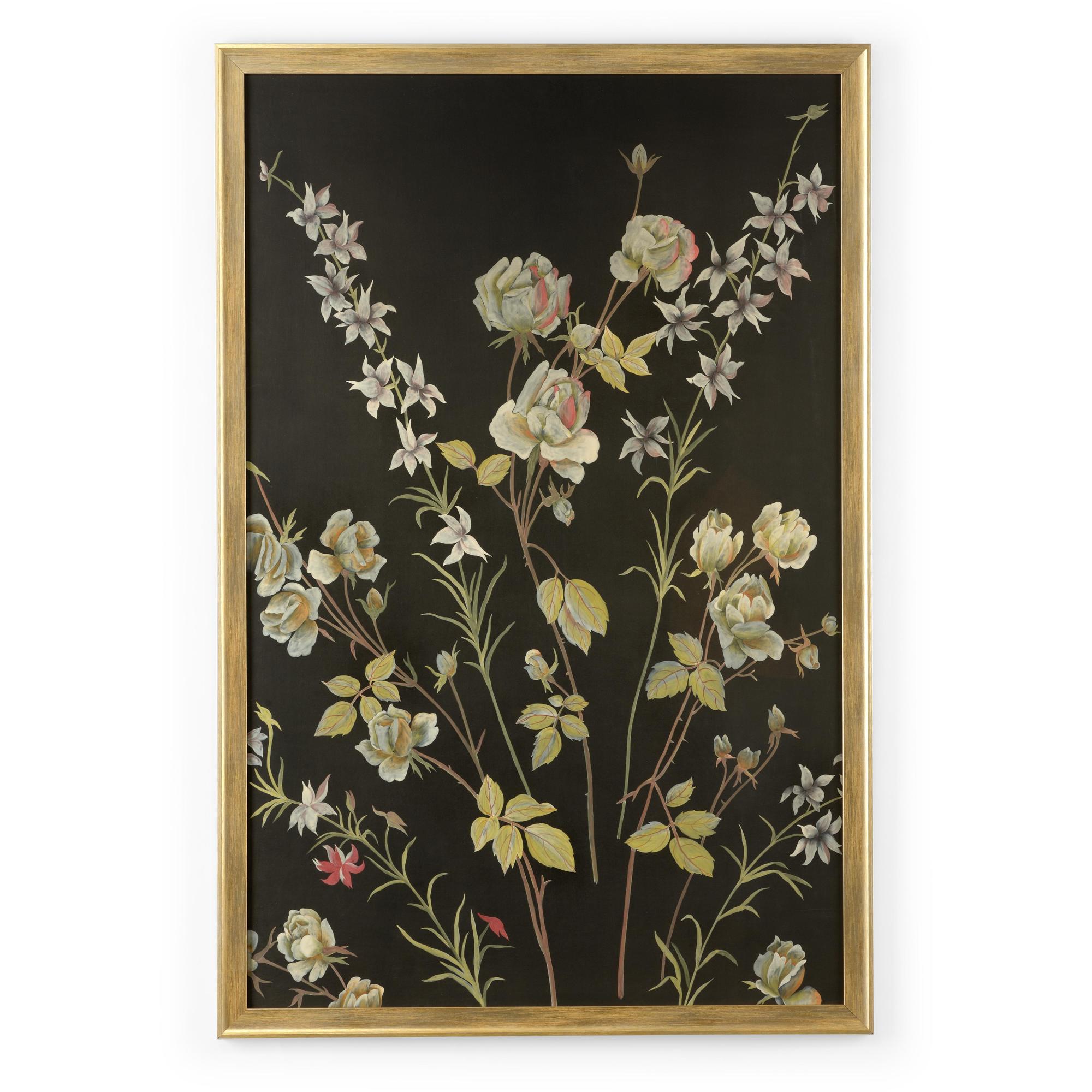 Mounted in a contemporary gold scoop frame with glass. Hand painted.