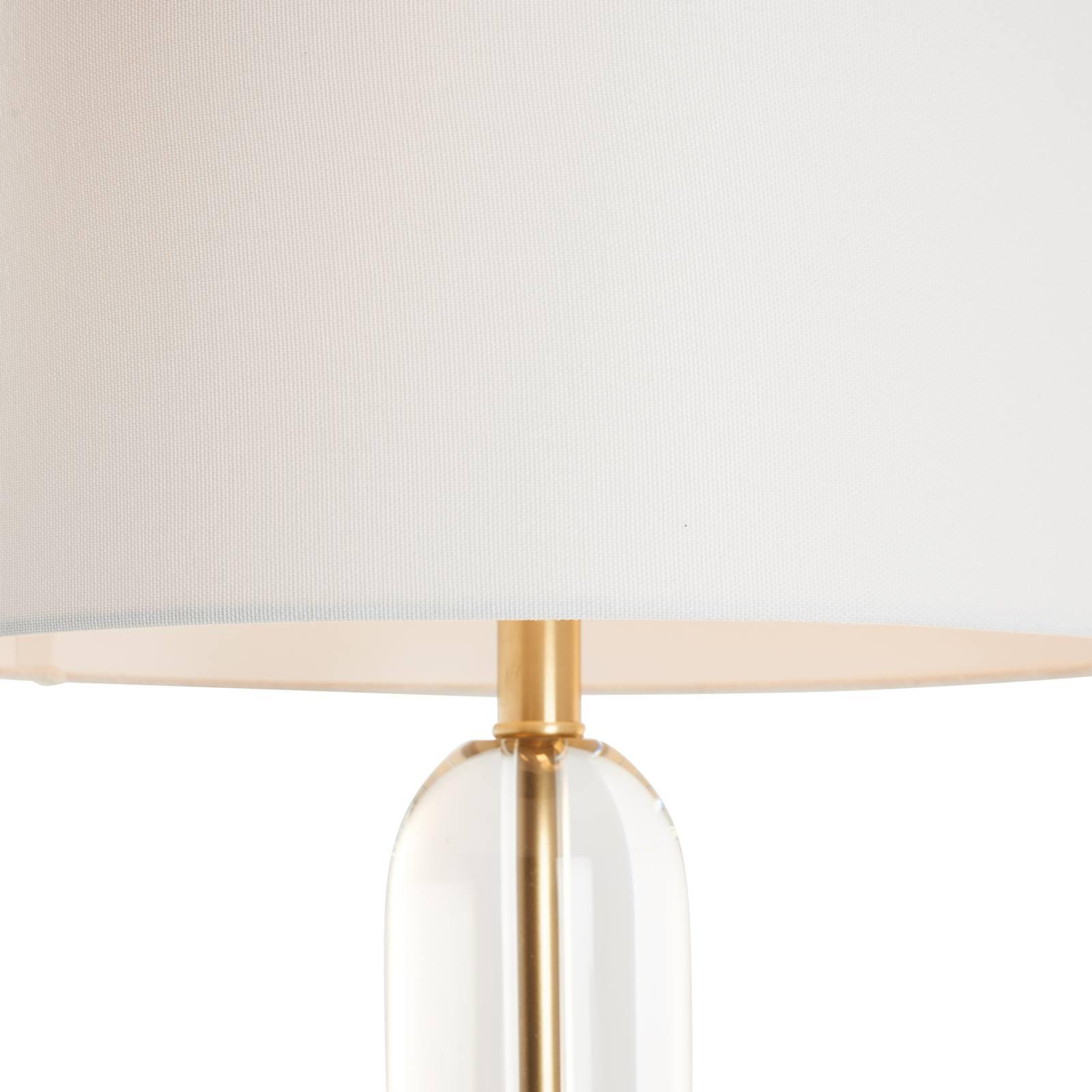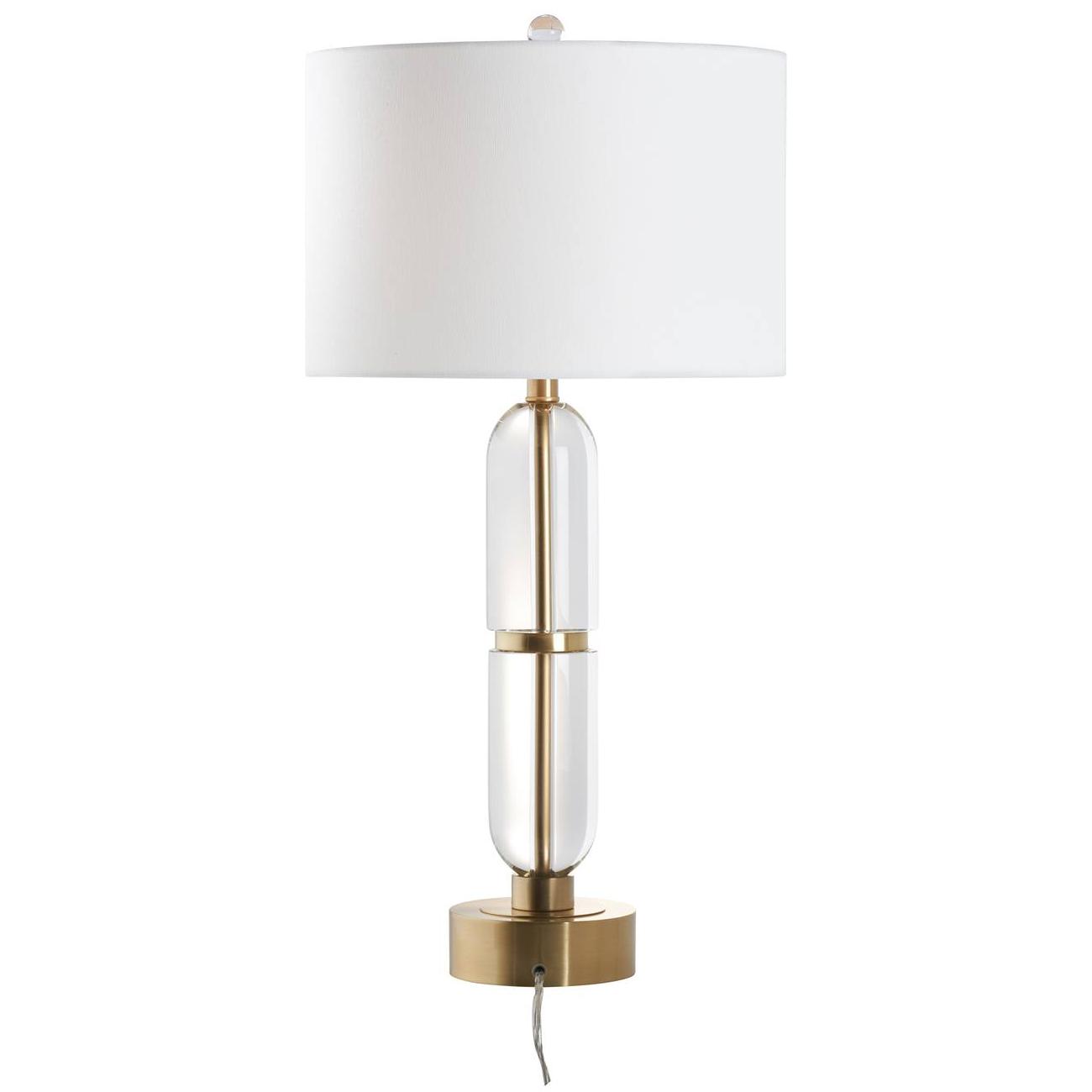 The Flynn Table Lamp combines sleek geometry with timeless elegance. Its cylindrical crystal base is accented by warm antique brass details, creating a refined balance of modern design and classic sophistication. Finished with a crisp white drum shade, the Flynn brings understated glamour and luminous clarity to any room.