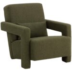Strong angles and plush seating allow the Forester Lounge Chair to stand out in any living space. Upholstered in copenhagen white boucle fabric with sculpted arms that give the reclining seat a floating appearance. Metal accents at the back of the armrests match the powder coated antique gold stainless steel base to finish the look.