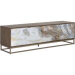 Incorporate a touch of extravagance to living space with this brilliant media console and cabinet that is full of rich detail. Features a brown wooden base in an oak veener with printed acrylic cabinet fronts that share a likeness to mother of pearl. Ample storage is available inside the four cabinets that include soft close doors. Completed with steel legs in a brass finish.