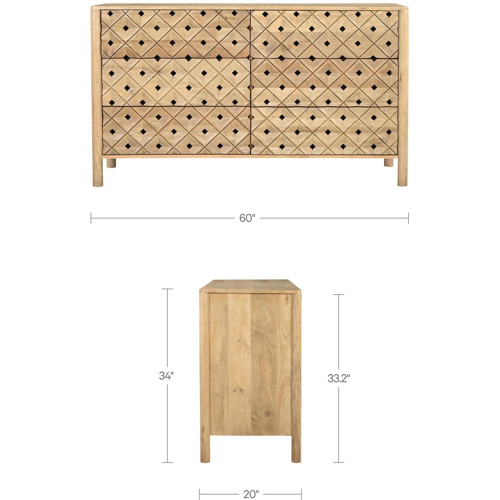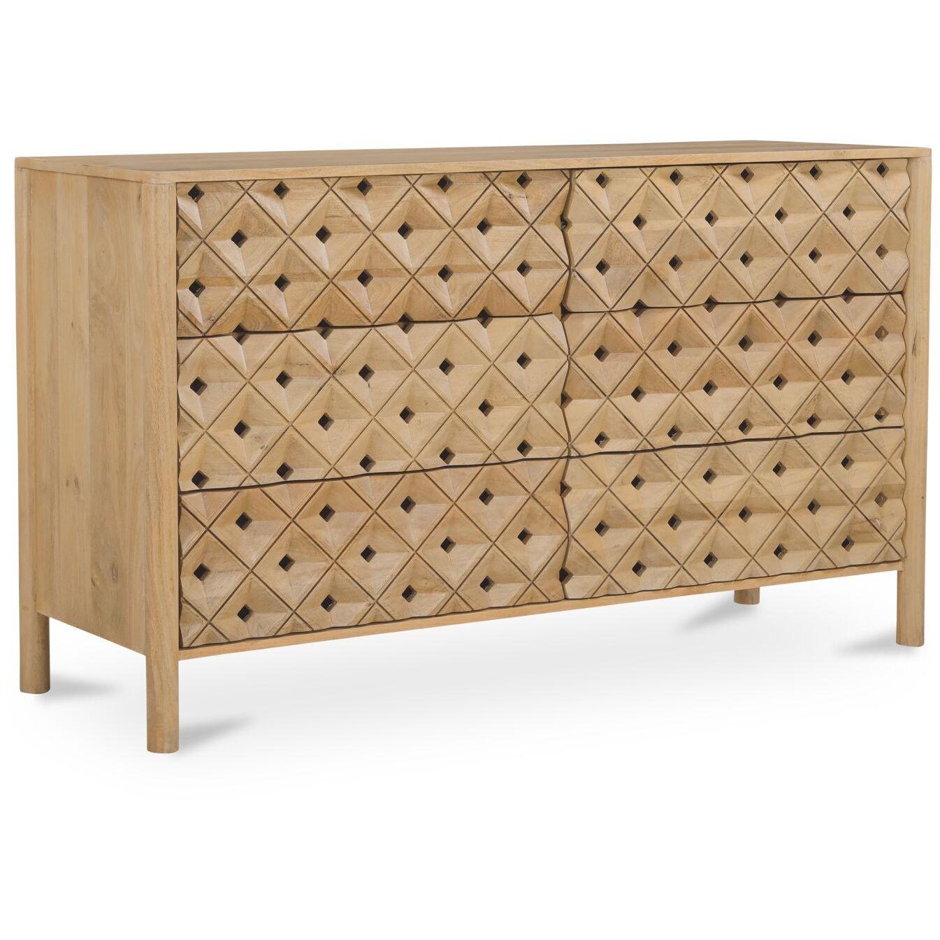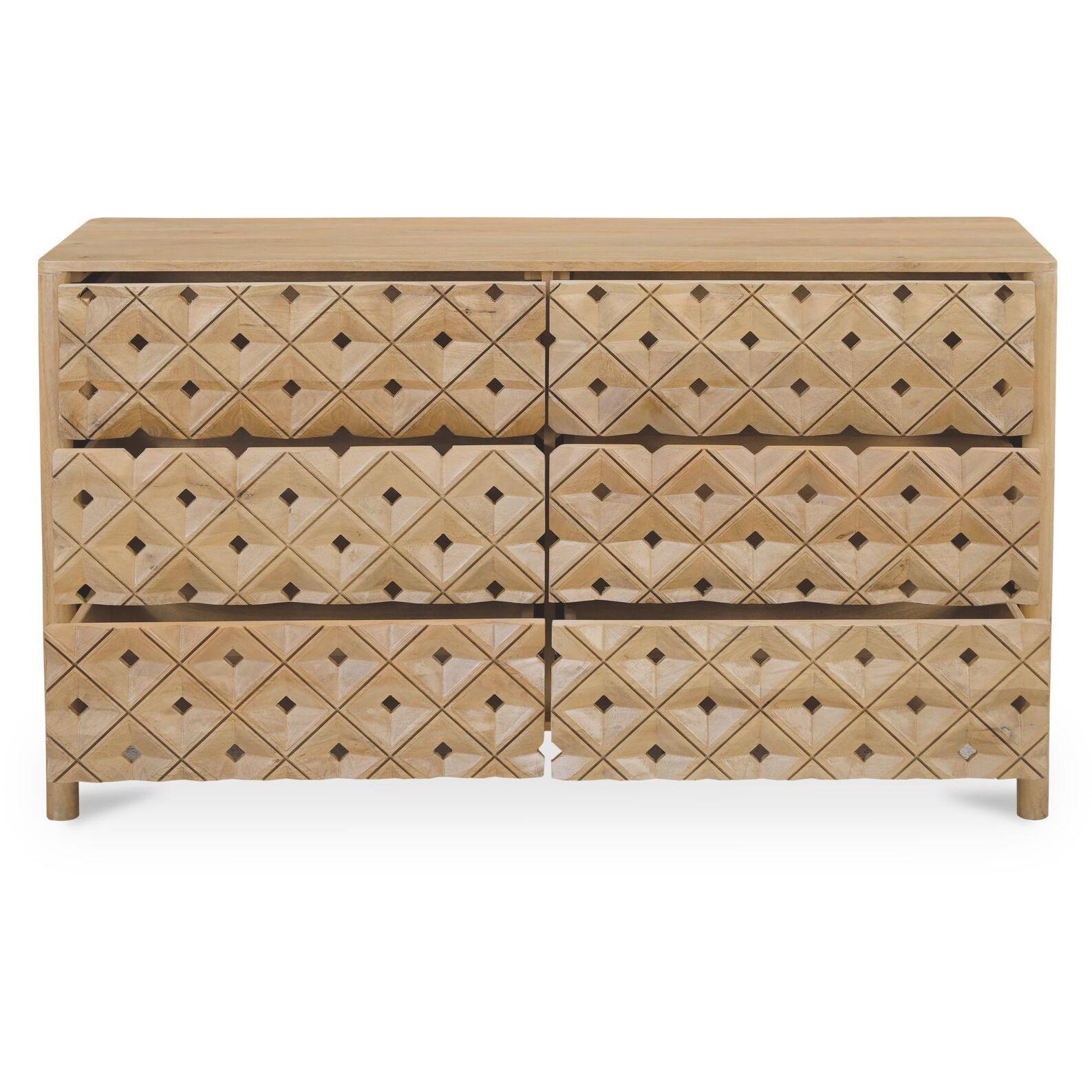 - Handcarved Detailing: Carved from a solid piece to emphasize continuous grain and depth, the pattern feels thoughtfully made while six drawers align seamlessly for a tidy façade.