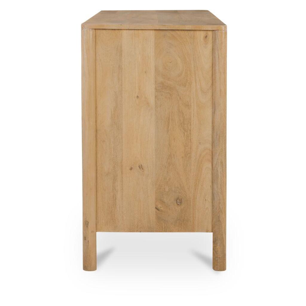 Carved from solid mango wood, the Fulton 6-drawer dresser’s geometric, off-centered front creates a striking focal point. Six spacious push-to-open drawers offer effortless functionality. The natural finish showcases the wood’s rich grain, celebrating its inherent beauty.