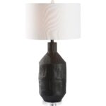 This ceramic lamp showcases a matte black finish accented by subtle lines and textures, creating a soft, understated elegance. Its minimalist design adds a touch of quiet sophistication.