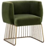 Rustic and modern charm come together in this dining chair. Stocked in our soft forest green and shadow grey fabric with a comfortable seat and unique brushed antique brass cage-style base. Perfect for dining, lounge and office spaces.