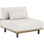Appreciate warmth and sunlight while seated in an outdoor dining space inspired by the Arizona desert. This modern armless chair features upholstery in palazzo cream fabric, atop a natural teak wood frame. Finished with a powder-coated aluminum base. Suitable for indoor and covered outdoor spaces.