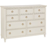 Brighten bedroom spaces with the Bondi Beach Dresser, a classic storage piece built with ten drawers featuring sleek gold ring pull hardware and tapered legs.