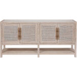 The Getaway Buffet packs a punch with lightly textured doors accented with sleek gold hardware, open-air storage, two tray drawers and adjustable interior shelving, all finished in a serene, neutral hue.