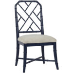 The bamboo-inspired Hanalei Bay Side Chair combines a subtly textured silhouette and a plush upholstered seat to create a stunning complement to any table. It is available in a white or blue finish.