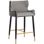 A classic counter stool featuring a substantial seat upholstered in contrasting dillon cream and dillon thunder faux leather. Diamond stitching on the seatback adds a hint of elegance while black wood legs and brushed gold foot caps complete the look. Handle With Care: This design has been crafted with faux leather. Faux leather is manufactured to reflect the natural characteristics of leather; as such, colour variations, markings, wrinkles, grooves, and light scratches are appreciated characteristics. No two pieces will be alike.