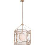This chandelier lantern features a white glass globe elegantly encased in a sleek metal square frame, blending classic charm with modern geometry. Its unique design adds a striking focal point to any room. Comes with (2) 12″ rods and (1) 6″ rod.