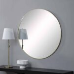 A satin brass frame gives this round mirror a warm radiance. Set above a prominent piece of furniture, this wallmount mirror is intended to highlight the furnishings in its midst and allow for those in the home to take in their appearance. This framed mirror can easily blend into its surroundings if that is the intention, but it has the power to act as a work of art in a minimalist setting as well.