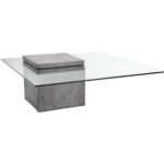 A bold concrete block defines this industrial modern coffee table. Features a contrasting 10mm tempered glass top embedded within the top of the base. A perfect complement to the design. Crafted from a natural concrete mix, each piece will look different. Variations in colour, texture, imperfections, surface scratches and non-structural hairline cracks are considered inherent and valued qualities of the material.