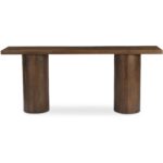 The Hadley console table showcases the natural beauty of reclaimed neem wood with understated elegance. Its minimalist design features a substantial 2-inch-thick rectangular top resting on robust cylindrical bases. Each piece tells a unique story through subtle variations, a testament to the wood’s previous life.
