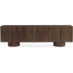 Crafted from reclaimed neem wood, the Hadley media unit celebrates simplicity and natural beauty. Its minimalist silhouette features a substantial 2-inch tabletop and cylindrical bases, artfully balancing form and function. Six sleek doors conceal ample storage, while thoughtful cable management ensures seamless integration.