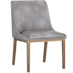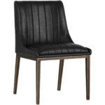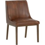 A sleek, urban designed dining chair featuring bold vertical stitching on the seat and back in masculine bravo cognac faux leather. Finished with a rustic bronze steel frame. Place in dining and office spaces for a retro look.