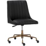 A sleek, urban designed office chair featuring bold vertical stitching on the seat and back in a beige linen fabric. Finished with a rustic bronze aluminum base with added castors for mobility.