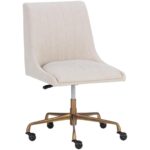 A sleek, urban designed office chair featuring bold vertical stitching on the seat and back in a masculine vintage black faux leather. Finished with a rustic bronze aluminum base with added castors for mobility. Also available in beige linen fabric. Handle With Care: This design has been crafted with faux leather. Faux leather is manufactured to reflect the natural characteristics of leather; as such, colour variations, markings, wrinkles, grooves, and light scratches are appreciated characteristics. No two pieces will be alike.