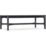 Crafted of solid Mahogany with a crisp black finish smooth as butter in an elegant matte finish, this mid-century modern-inspired coffee table has a curved trestle base and a rectangle shape with rounded corners. Measures 52 W x 28 D.