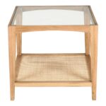 The Harrington side table features a sculpted frame made of solid oak, with a tempered glass tabletop and lower shelf woven from natural cane. Natural wood textures and colors combine to create a modern rustic standout.