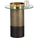 This stunning end table features a cylindrical stainless steel base in brown and gold finishes for a captivating contemporary look. Finished with a tempered clear glass and polished gold steel tray top. Can be paired with our Haru coffee table. Suitable for residential and commercial spaces.