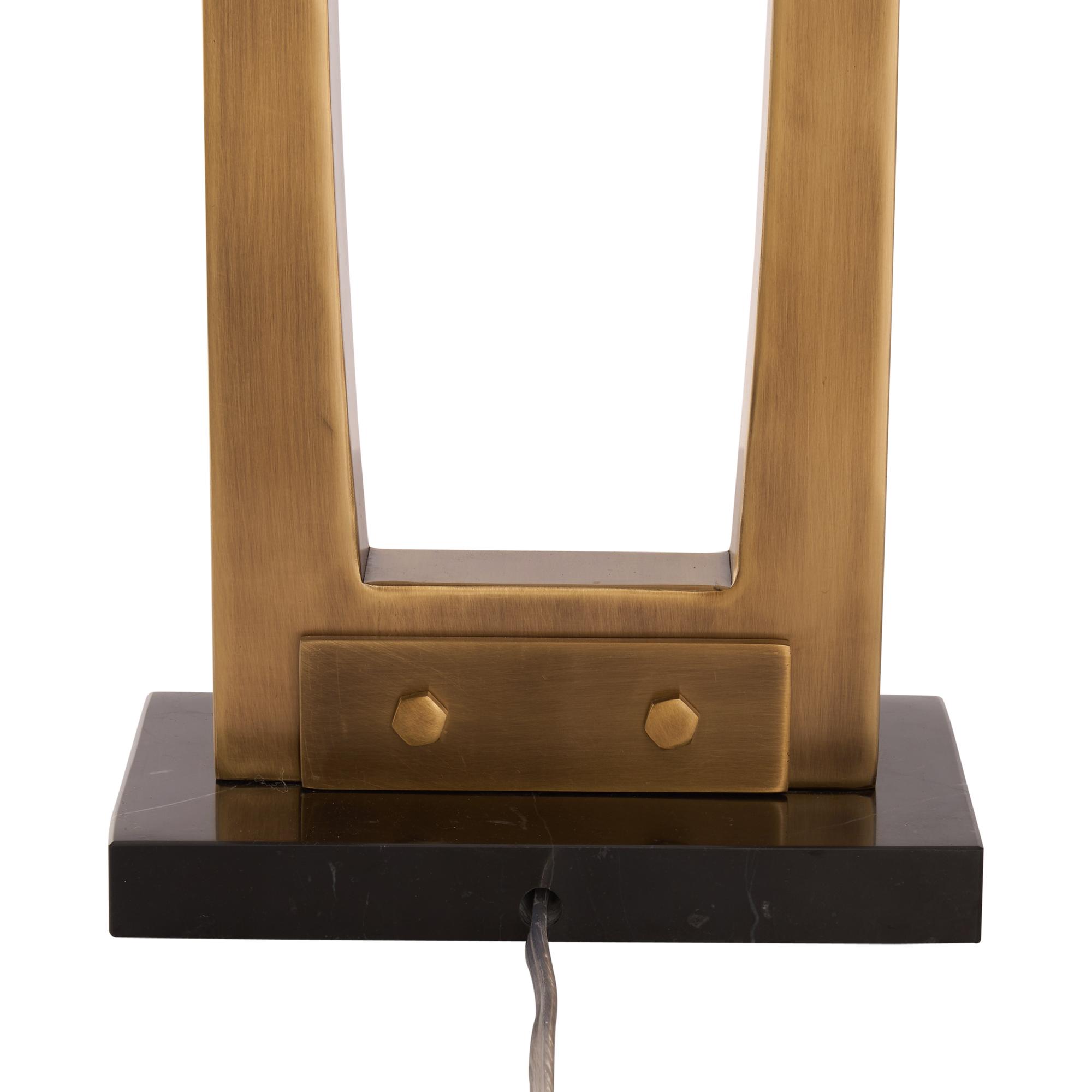 The Hattie Lamp features a bold, open-frame silhouette in an antique brass finish, anchored by a sleek black marble base. Its clean lines and refined materials lend a modern industrial elegance to any interior.