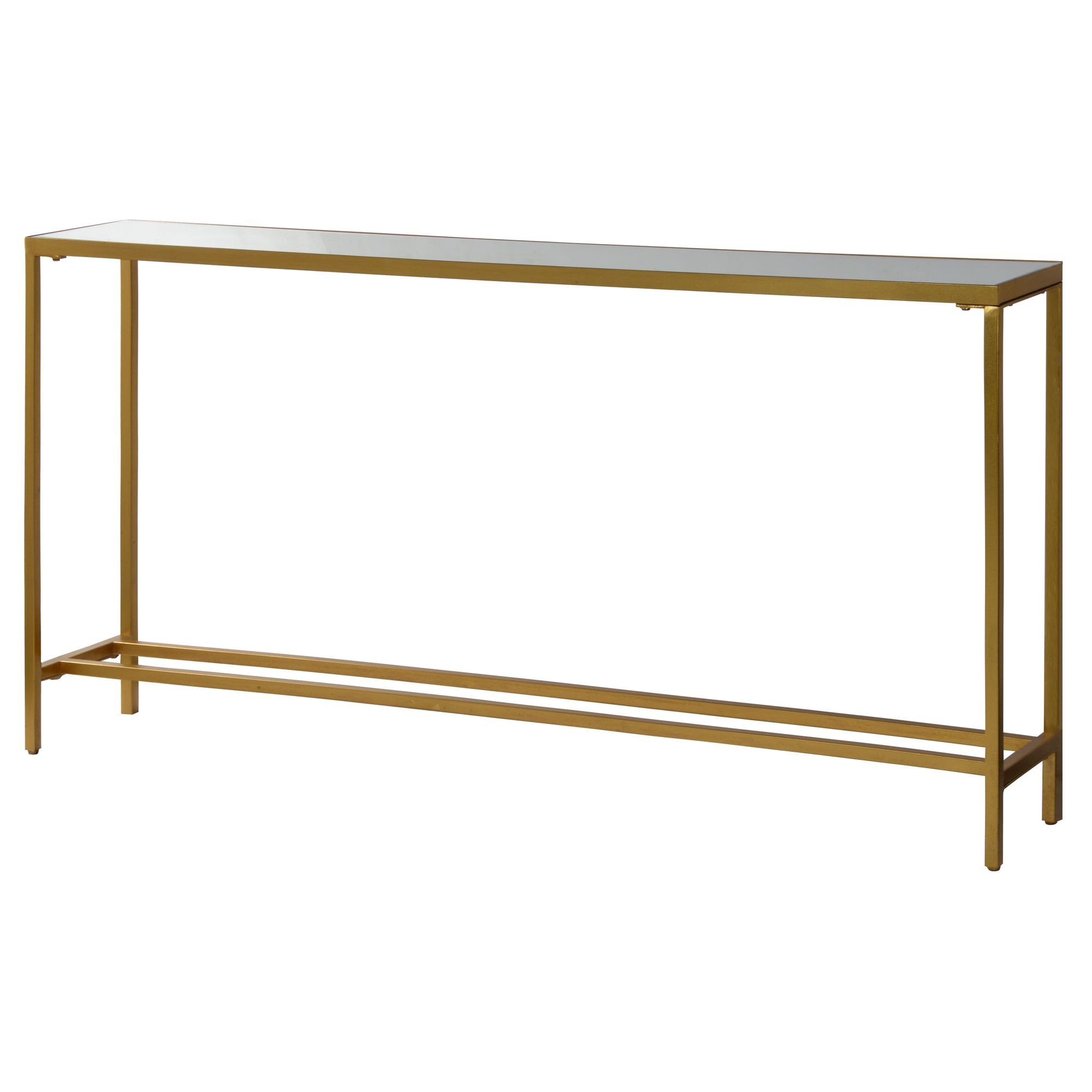 Streamlined and sophisticated, this decorative console table makes the perfect furniture piece for rooms with a modern minimalistic sensibility. Supported by an open iron frame in a glamorous gold leaf finish, the long rectangular glass tabletop is a mirror that reflects the likeness of every decorative object above. The barely there silhouette of the accent table effortlessly slides behind a couch, its slender proportions serving as a showcase for decorative objects and art.