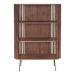 A bookshelf featuring richly veneered, natural solid walnut with 3 shelves, rounded Mid-century modern form, gated paneling that details its sides and back, and slightly flared steel legs.