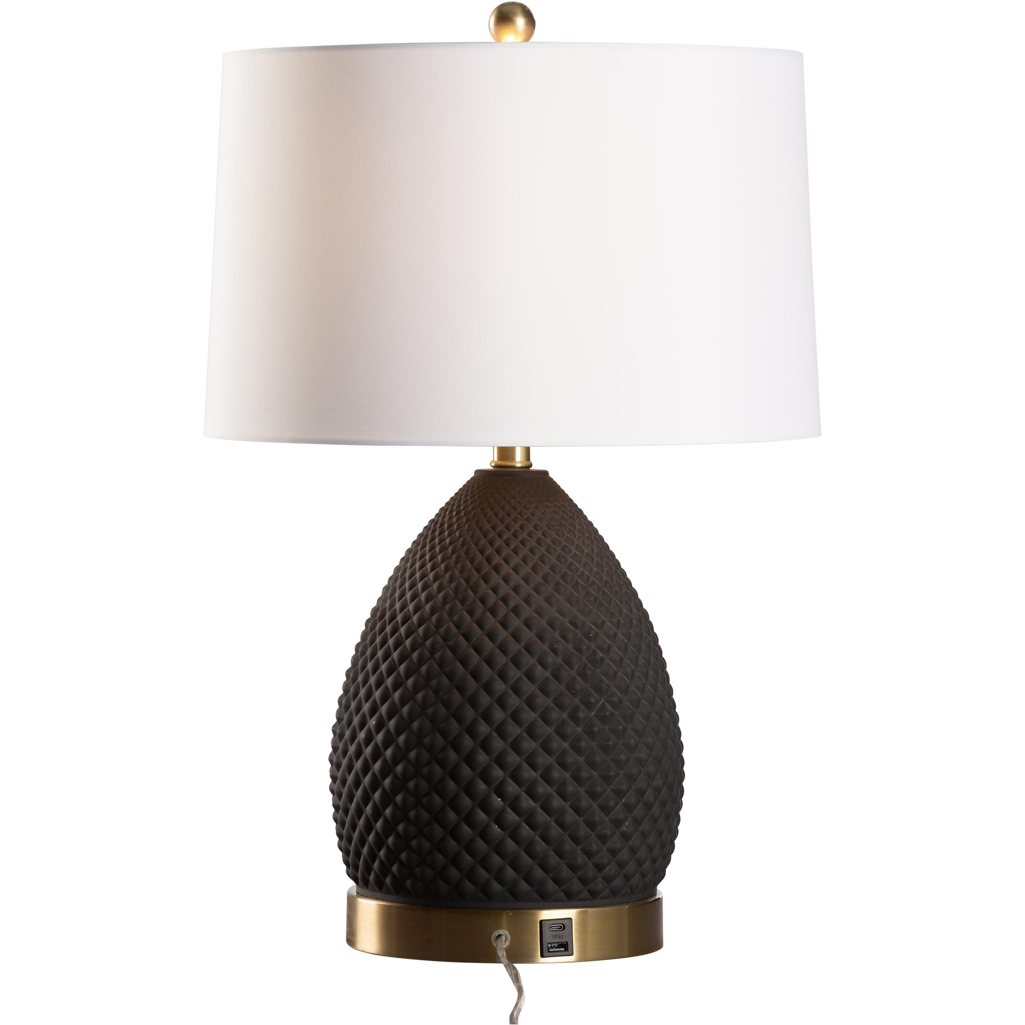 The Hester Lamp features a sculptural black ceramic base with a textured diamond pattern, complemented by an antique brass base. With a built-in USB port, it combines bold design with modern convenience—perfect for bedside or workspace lighting.