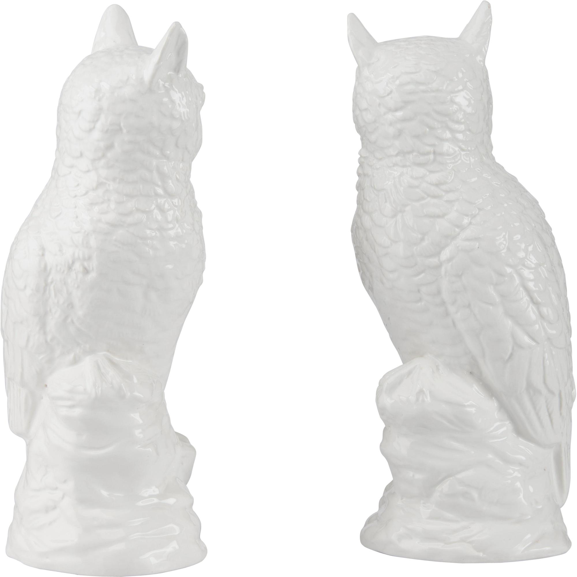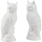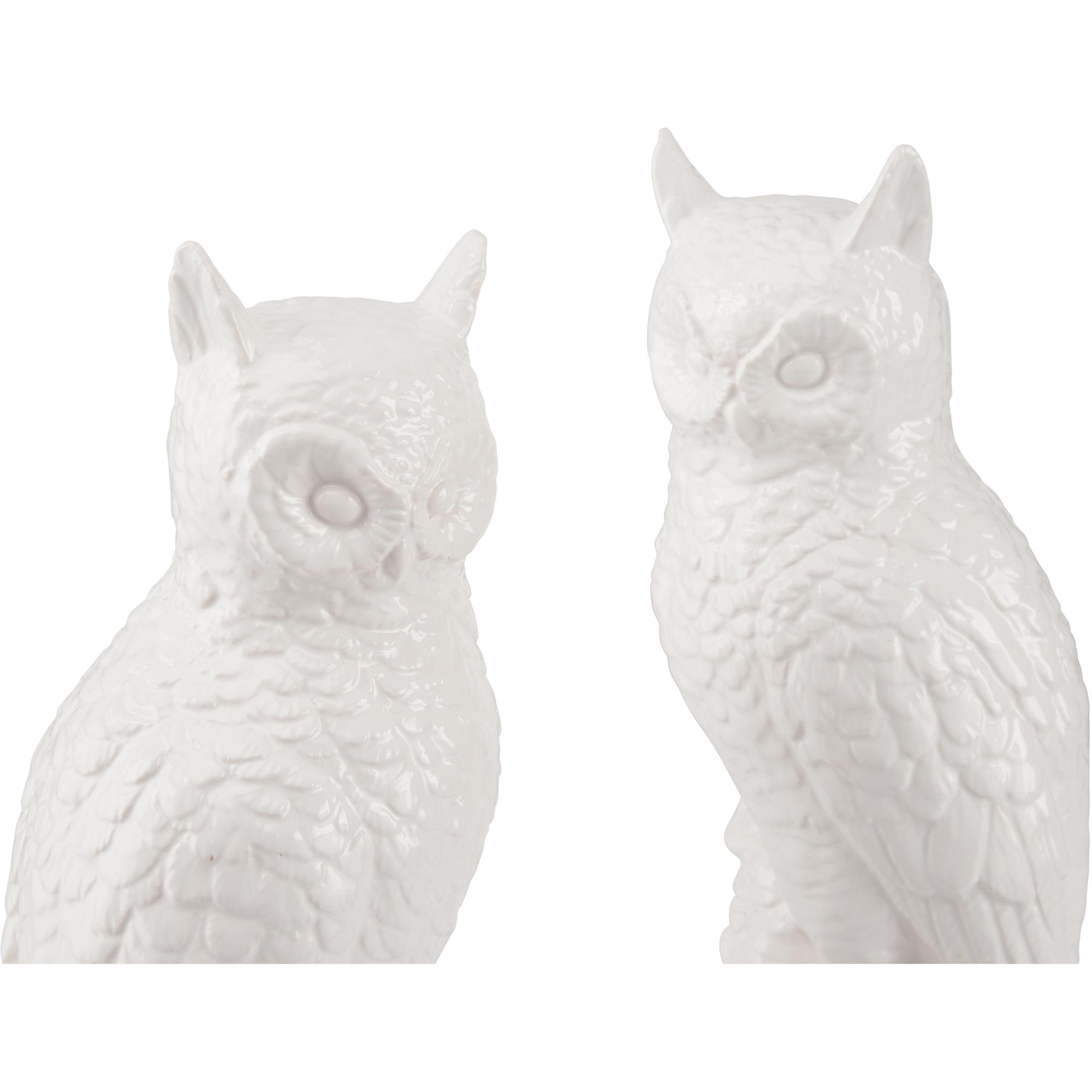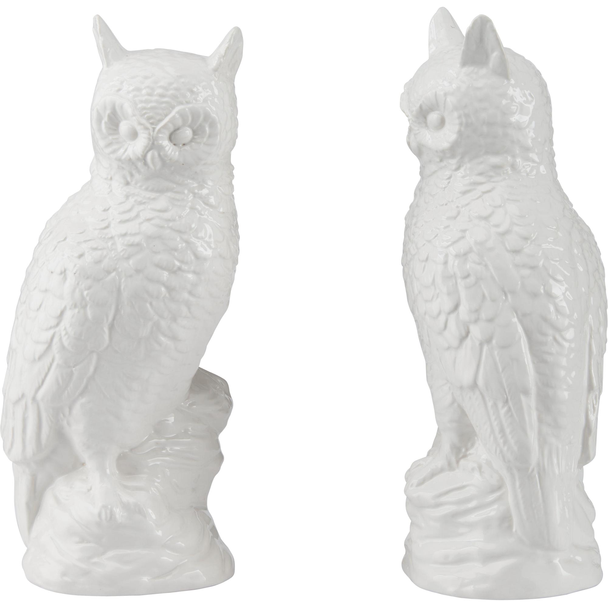 This charming pair of white ceramic owls features a glossy finish and subtle detailing that highlight their wise, whimsical character. Perfect as decorative accents, they add a touch of playful elegance. Designed by Shayla Copas.
