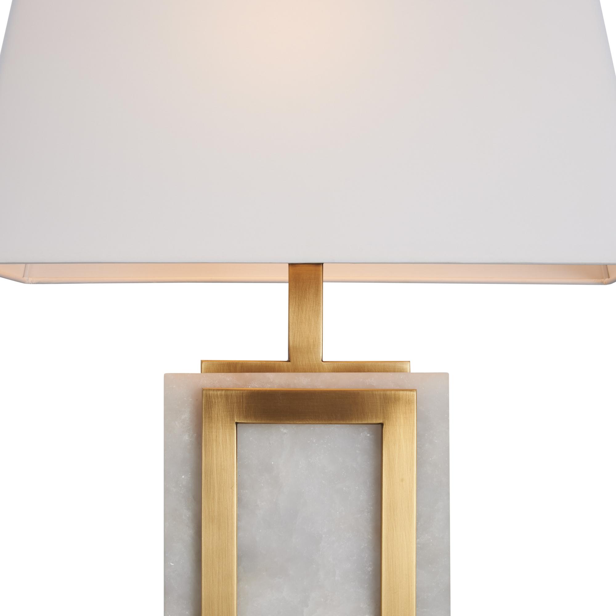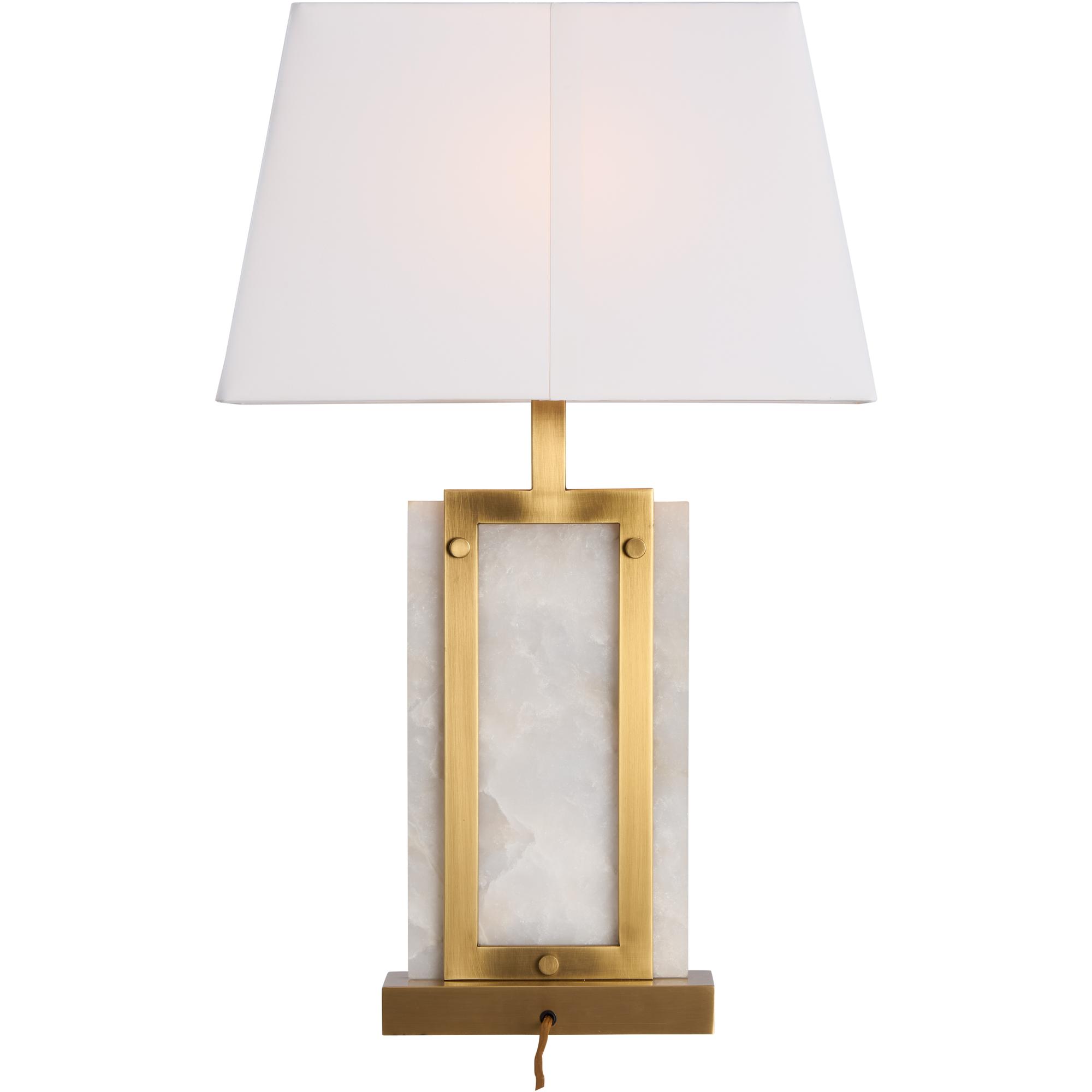 The Hopewell Lamp exudes refined elegance with its luminous alabaster body framed in warm antique brass. The geometric design strikes a perfect balance between classic and contemporary, while the crisp white tapered shade casts a soft, inviting glow. A timeless accent ideal for both sophisticated and modern interiors.