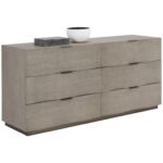 The Hoyos dresser is a study in simplicity. Subtle curves on the drawer fronts give added definition to its silhouette. Crafted from poplar wood and oak veneer with warm brass aluminum handles. As wood is an organic, porous material, these pieces will contain natural variation of texture and may also exhibit fine indentations and cracks. Wood pieces will also display a disparity of colour and grain, and visible knots and burls that add to the character of each piece.