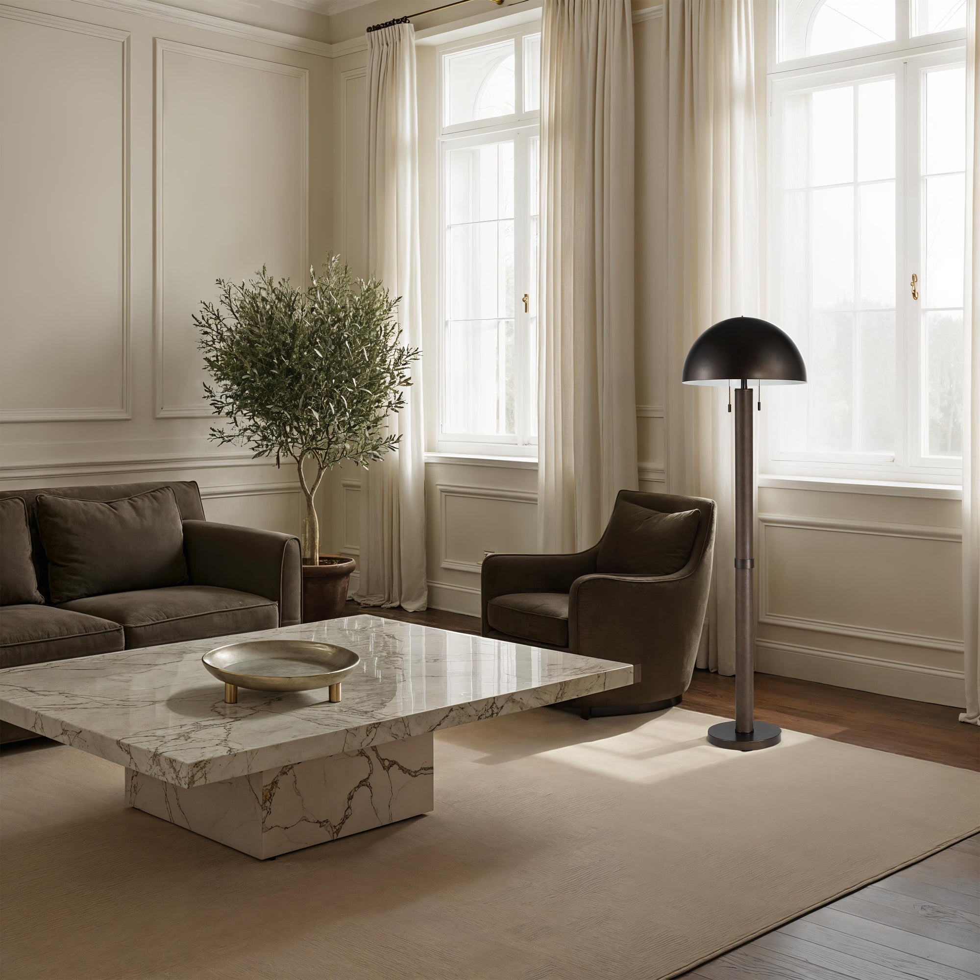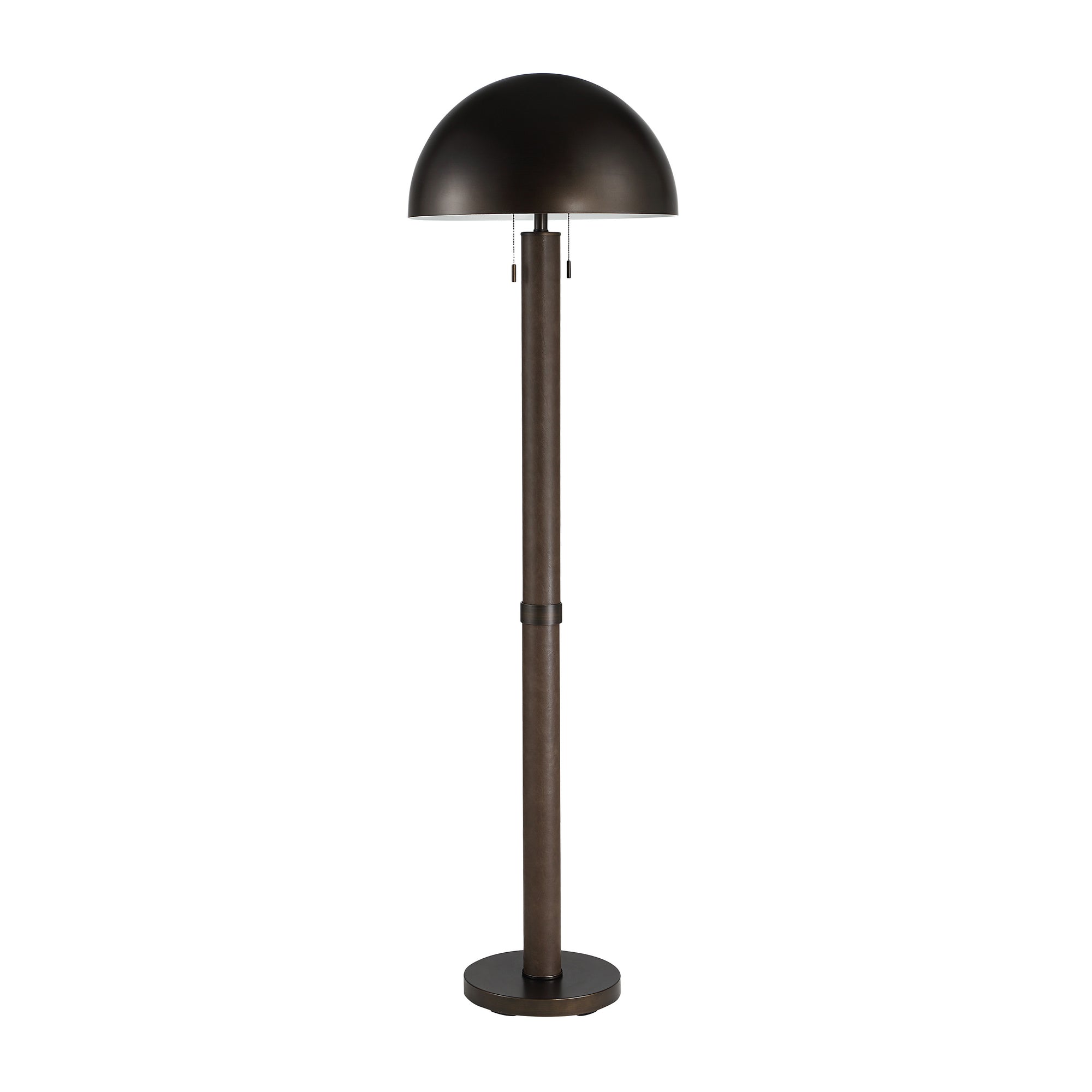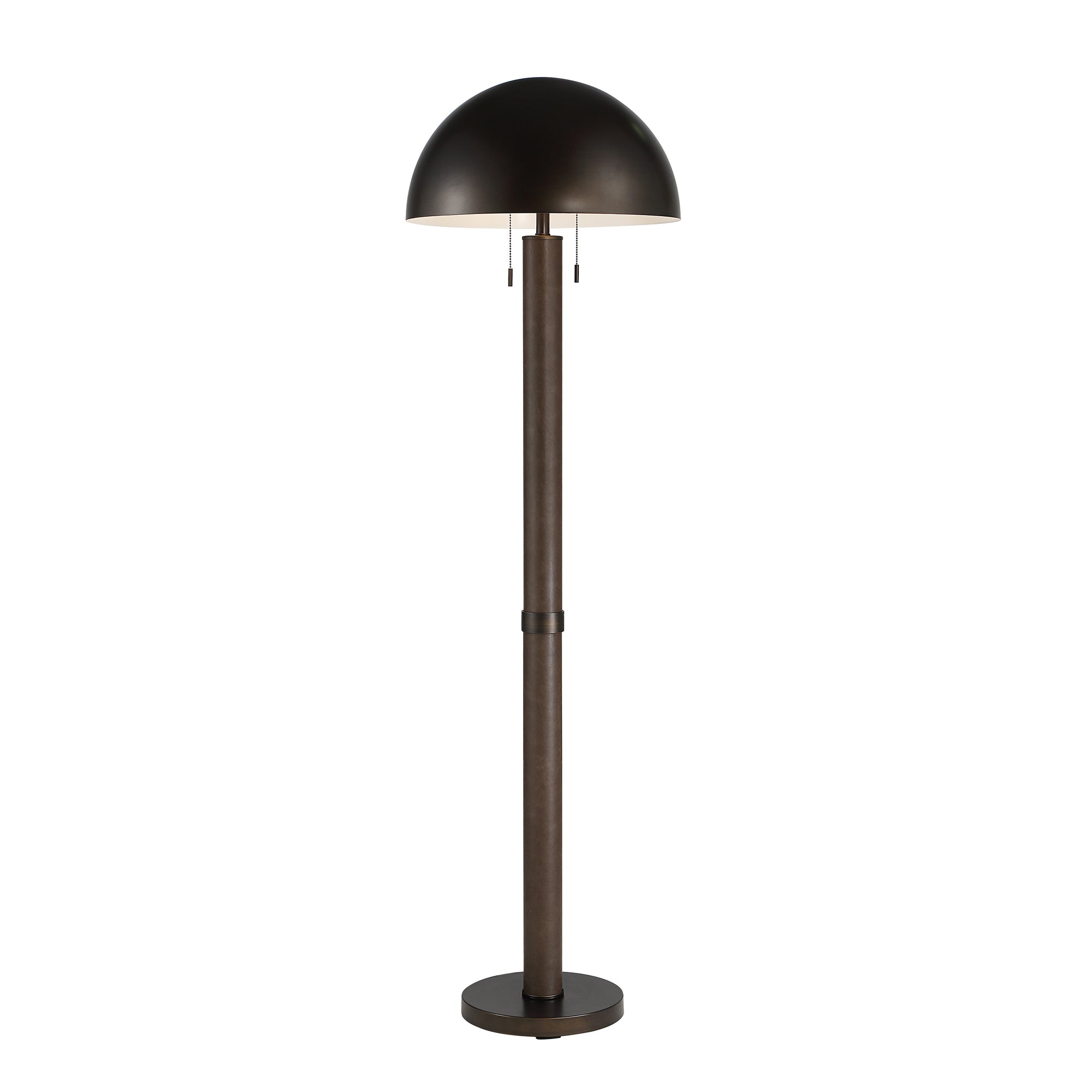 Bring modern edge to any space with the Incanto floor lamp. Finished in rich dark bronze with subtle faux-leather accents, its smooth iron body and sleek dome shade hold an understated, minimalist presence. A simple pull-chain adds easy everyday functionality, making this lamp a welcoming addition to bedrooms, living areas, or any corner that could use a soft, stylish glow.