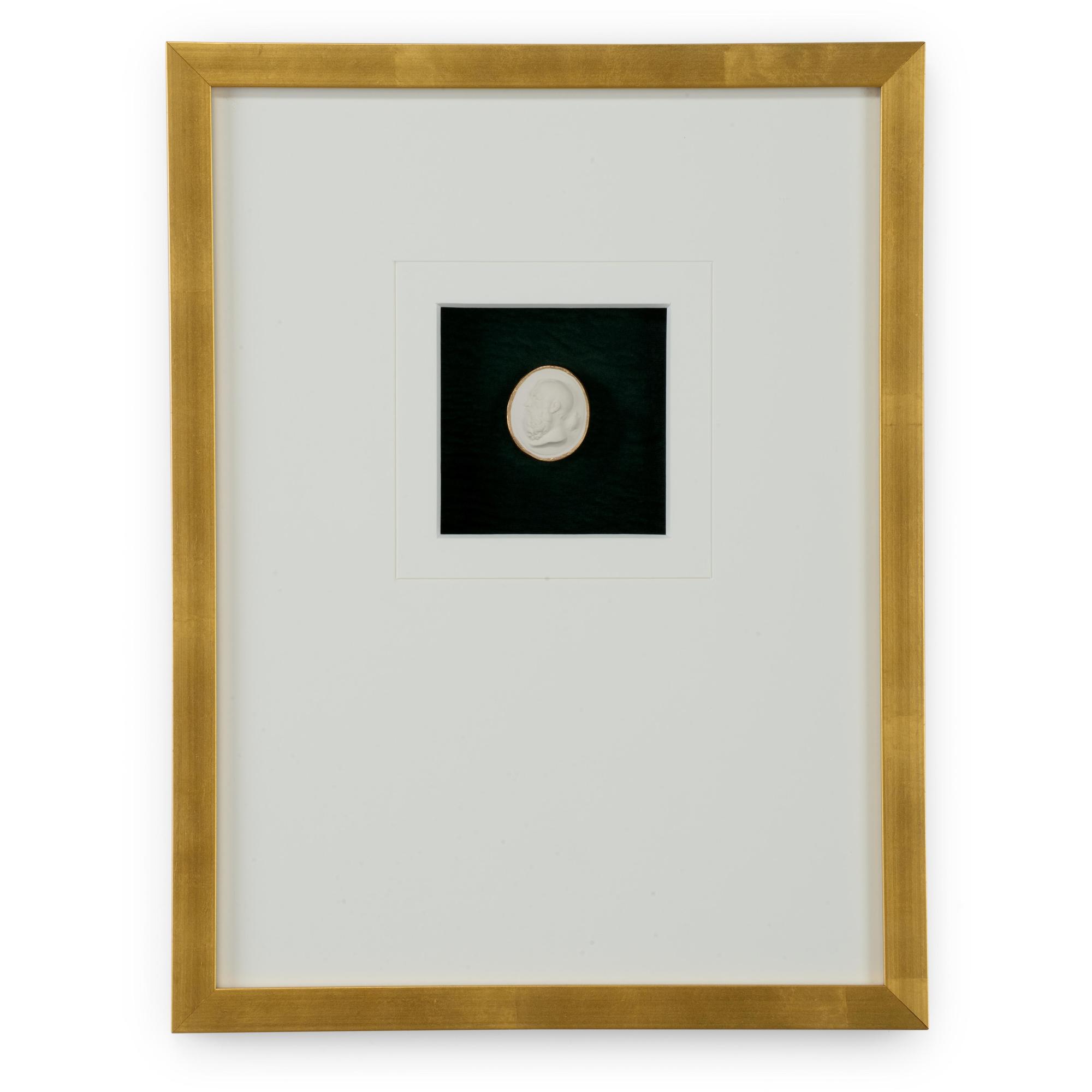 Intaglios on a deep green background in a contemporary gold leaf frame with a 6 ply white mat, under glass